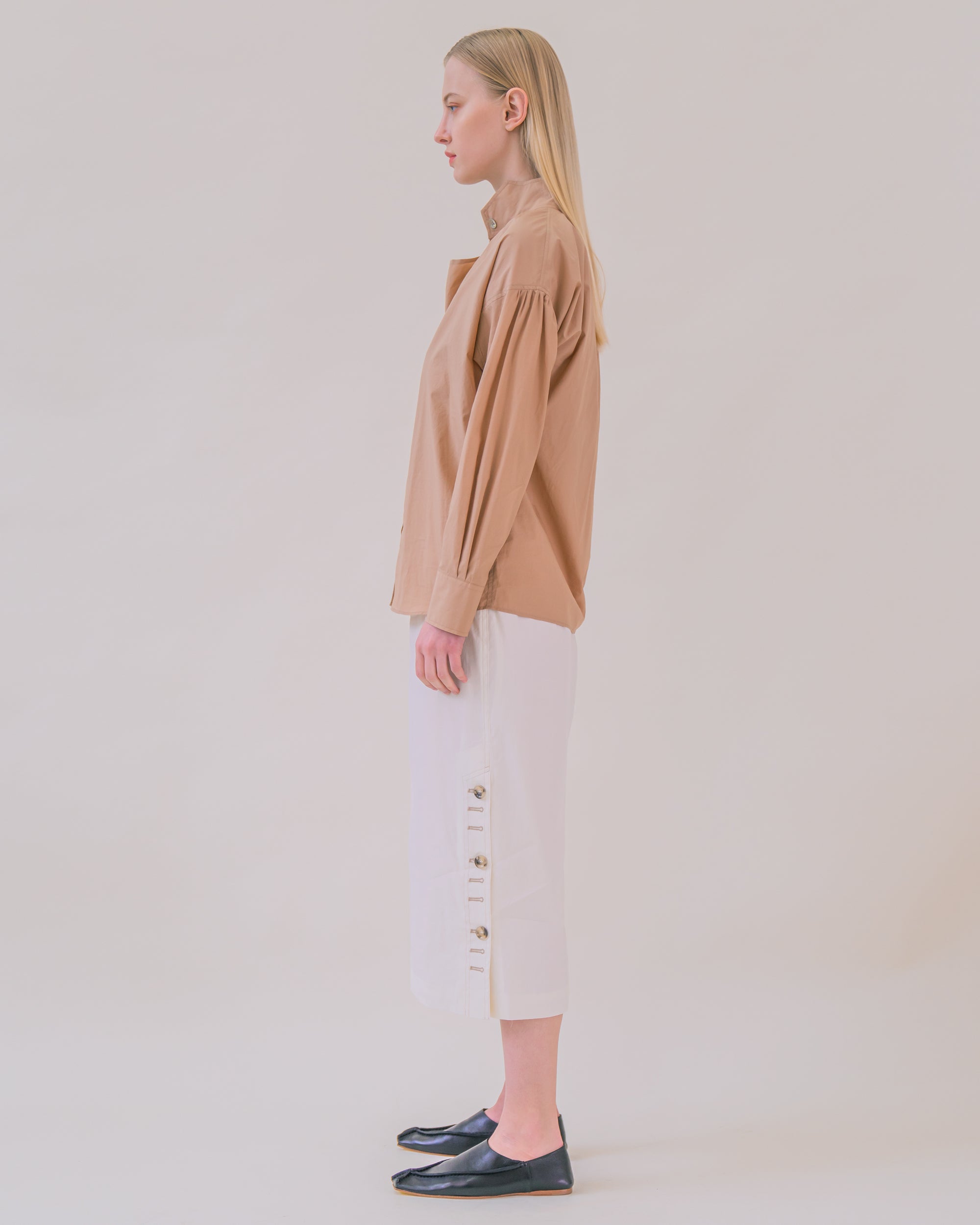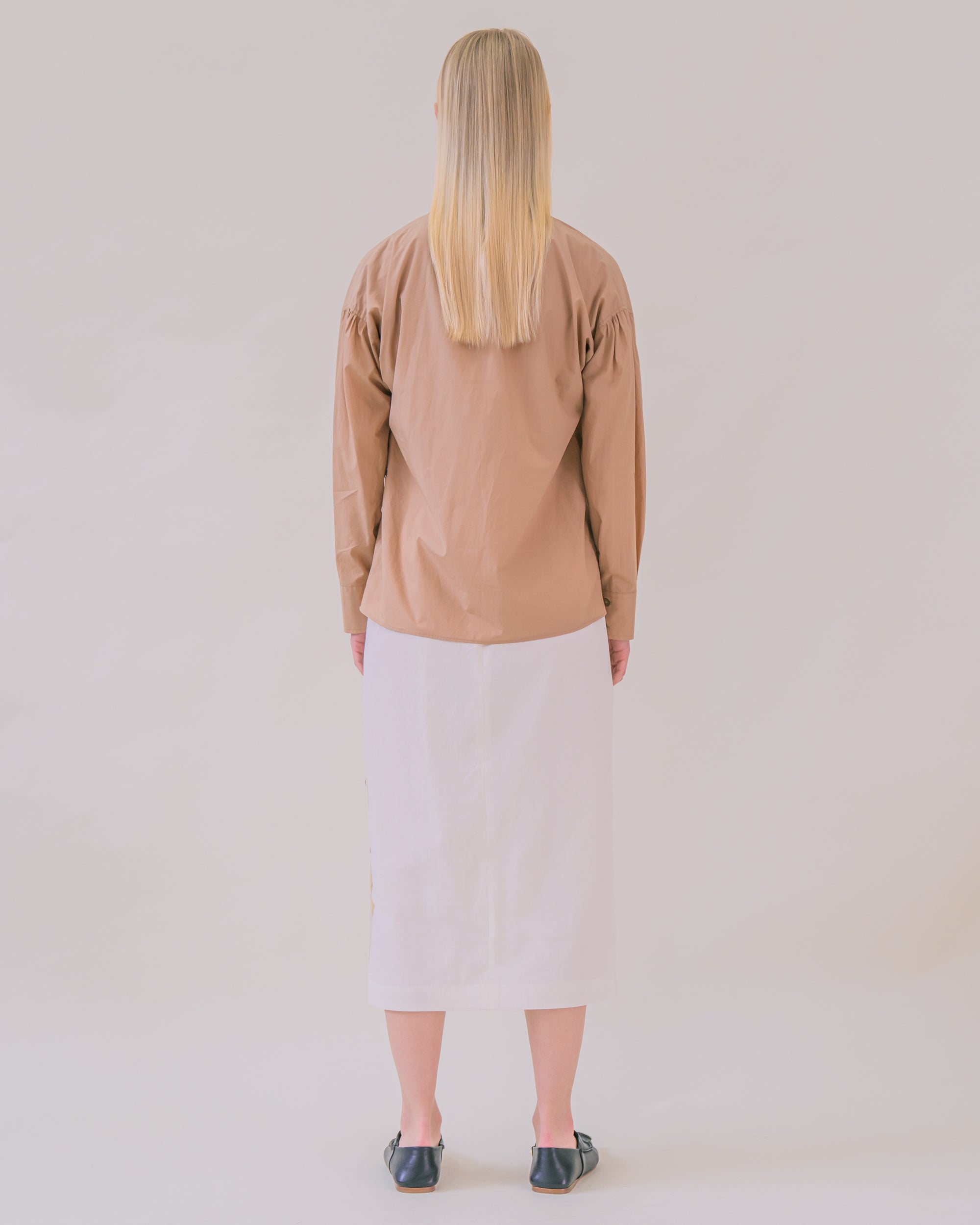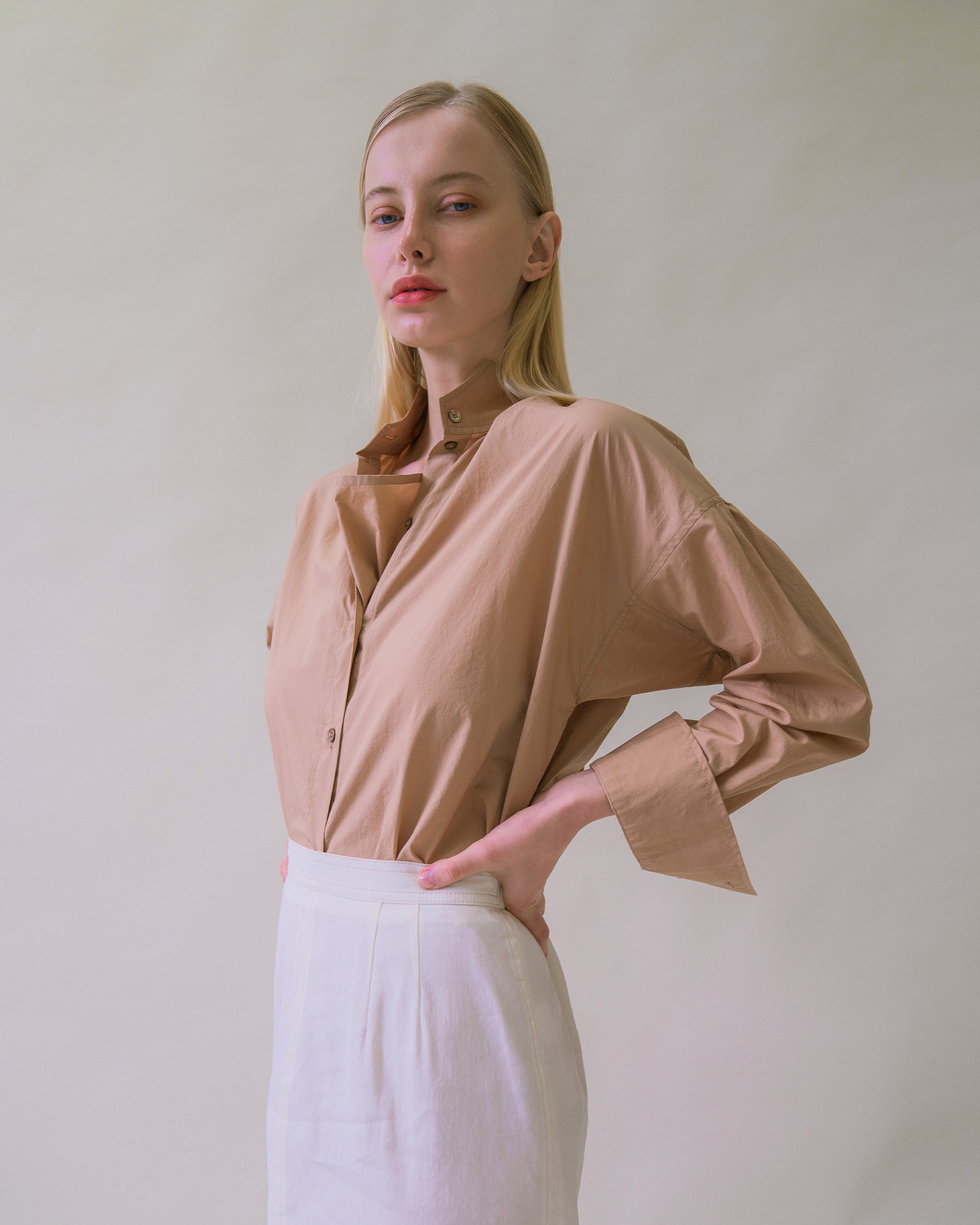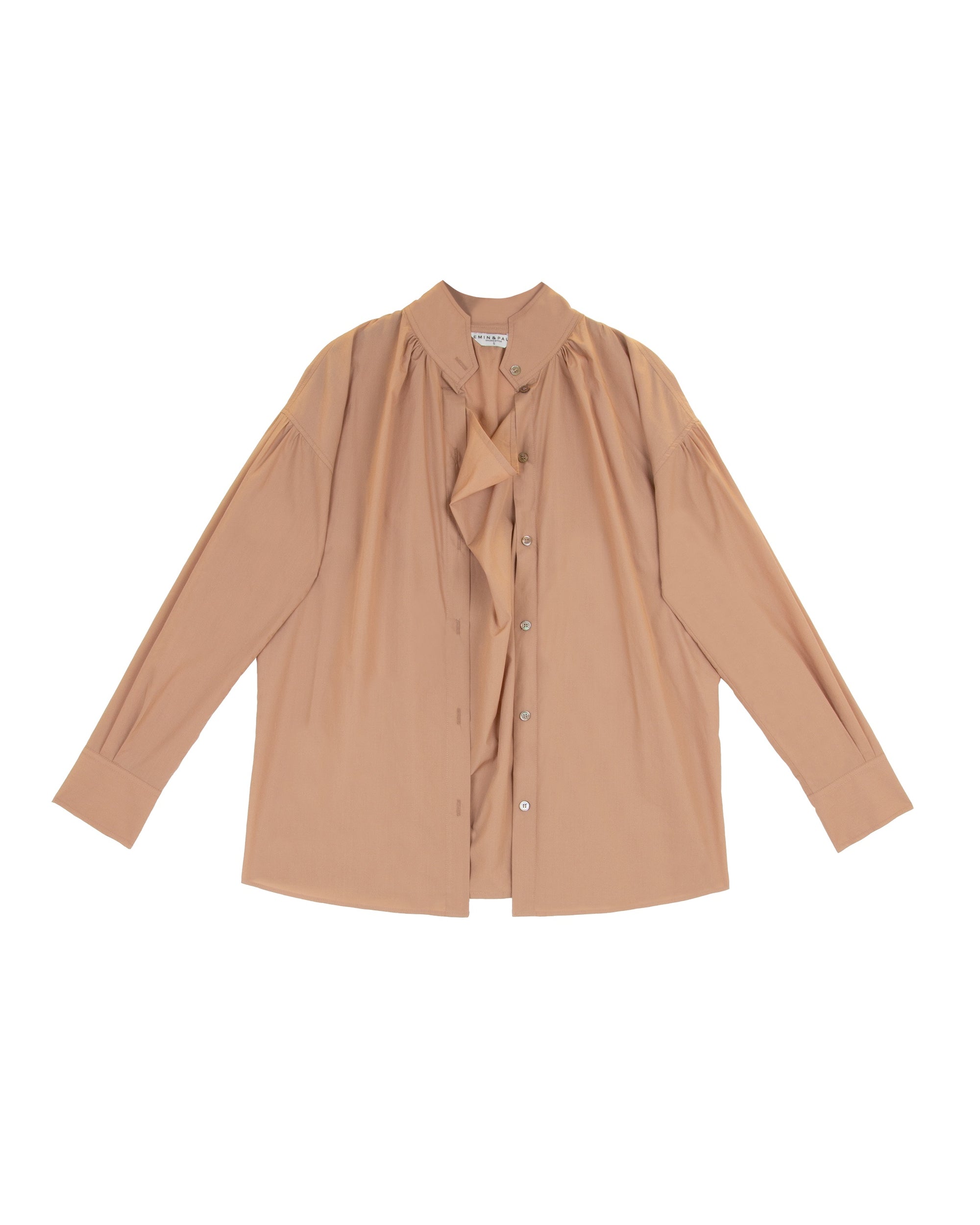 Sand Ruched Tie-Neck Blouse